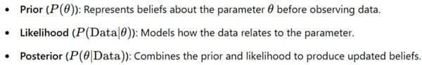 - Prior: It represents our initial knowledge or assumption regarding a parameter before observing data.