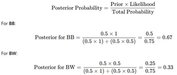 - If BW is true (one black ball and one white ball), the chance of drawing a black ball is 50% (0.5).