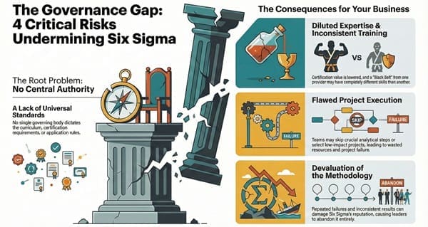 This absence leads to several issues, similar to having a rulebook for a game where every player can interpret the rules differently. This lack of standardization directly impacts the quality and trustworthiness of Six Sigma certifications and project outcomes.