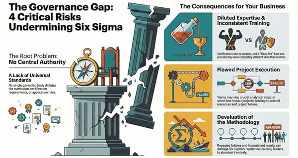 The biggest risks Six Sigma faces are all interconnected. They stem from the core issue of a non-standardized environment. This creates confusion for both individuals seeking certification and companies trying to implement the methodology effectively.