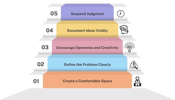 - Suspend Judgment: During brainstorming, there should be no criticism or evaluation of ideas. This helps people feel safe to contribute without fear of rejection.