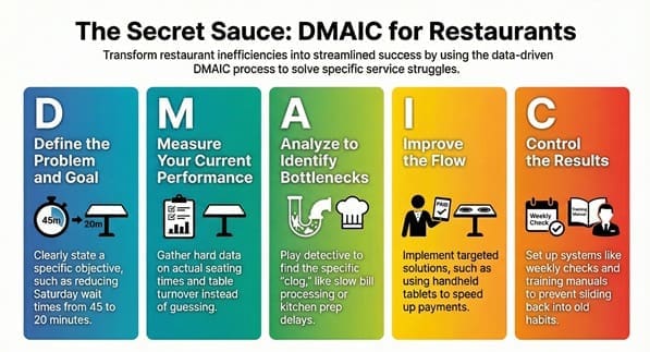 To really understand how can Six Sigma be used in a restaurant, we have to look at the DMAIC phases. This is the “secret sauce” of the methodology. It stands for Define, Measure, Analyze, Improve, and Control.