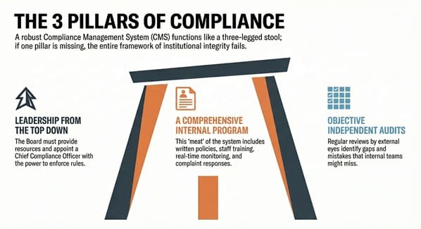 A Compliance Management System (CMS) is a whole-company approach to managing legal requirements. It includes the documents, processes, and people who ensure your team follows the law. According to the FDIC, a good system helps you find and fix risks before they become big problems.