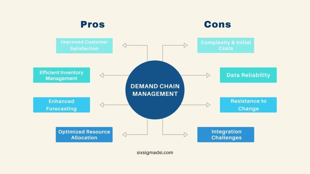 Demand Chain Management focuses on aligning a company’s supply chain with customer demand to enhance customer satisfaction, improve operational efficiency, and reduce costs. While it offers numerous benefits, it also comes with challenges related to complexity, data reliability, and the need for significant investments. Companies considering DCM should carefully evaluate its potential advantages and drawbacks to determine if it aligns with their business goals and capabilities.