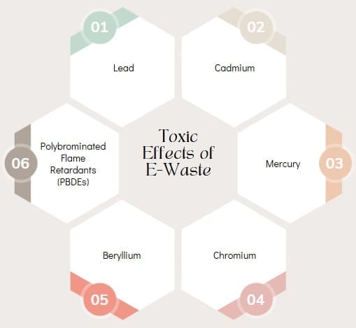 E-waste contains several hazardous substances, many of which can cause serious health problems when exposed to humans or the environment. The most concerning toxic substances include: