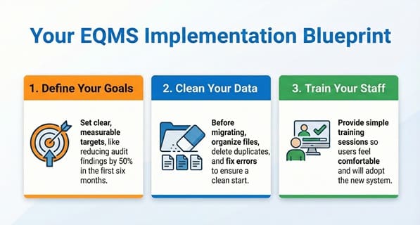 Eqms implementation starts with a plan. What do you want to achieve in the first six months? Maybe you want to reduce audit findings by 50%. Setting clear goals helps you measure success.