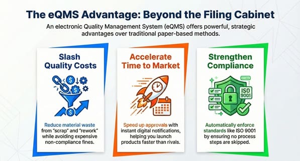An electronic quality management system speeds up approvals. In a paper system, a signature might sit on a desk for a week. In a digital system, the manager gets a notification on their phone instantly. This helps you launch products faster than your rivals.