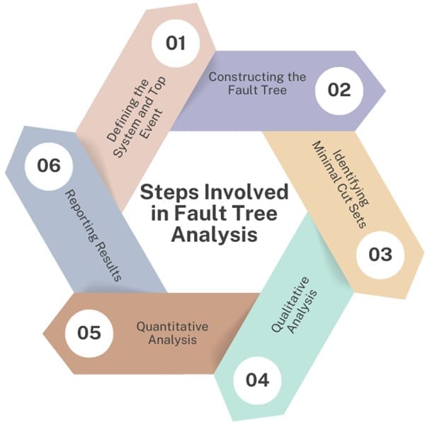 Fault Tree Analysis follows a structured set of steps to identify, assess, and quantify failure risks. The general process includes: