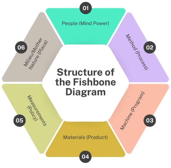 - 6M Fishbone Diagram: Common in manufacturing, with categories: Man/Manpower, Method, Machine, Material, Measurement, and Mother Nature.