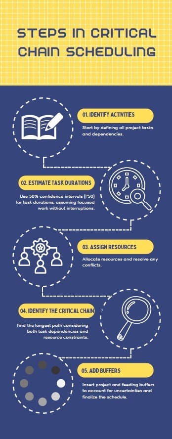 - Add Buffers: Insert project and feeding buffers to account for uncertainties and finalize the schedule.