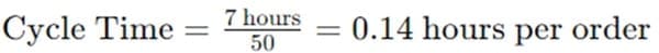 An online clothing company wants to measure the time to process a customer’s order. If their net production time is 7 hours per shift and they process 50 orders per shift: