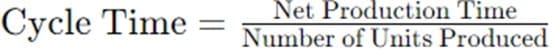 | Cycle Time | Time to produce a unit | Cycle time = Net production time / Units produced | Manufacturing process | Improve efficiency and productivity |