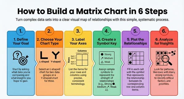 Creating a successful matrix chart follows a systematic and straightforward process. This sequential pattern ensures that the final diagram is both accurate and useful for decision-making.