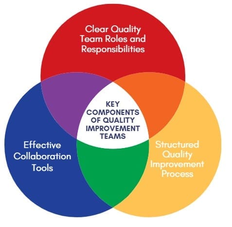 Quality improvement teams consist of cross-functional groups of professionals who work collaboratively to identify, analyze, and solve quality-related problems within organizations. These teams are often ad hoc collections of various professions and/or occupations, working together in time-limited ways to accomplish specific improvement objectives.