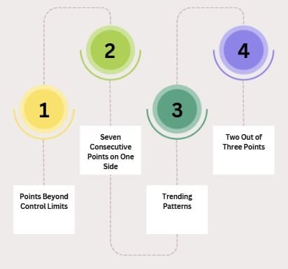 Statistical process control rules help interpret control chart signals systematically. These rules identify various out-of-control patterns beyond simple limit violations.