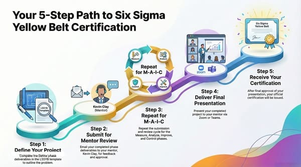 Certification Issued is the final and rewarding step. After presenting the project and receiving Kevin’s final approval, you will receive your official Six Sigma Yellow Belt Certification! This validates your ability to apply Lean Six Sigma principles. It shows you are ready to contribute to process improvement in your organization.