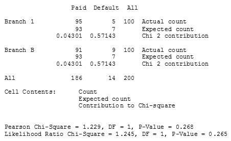Thus, even though the number of 5 defaults for Branch 1 and 9 defaults for Branch B seems to be a meaningful difference they aren’t different enough to support the Alternative Hypothesis.