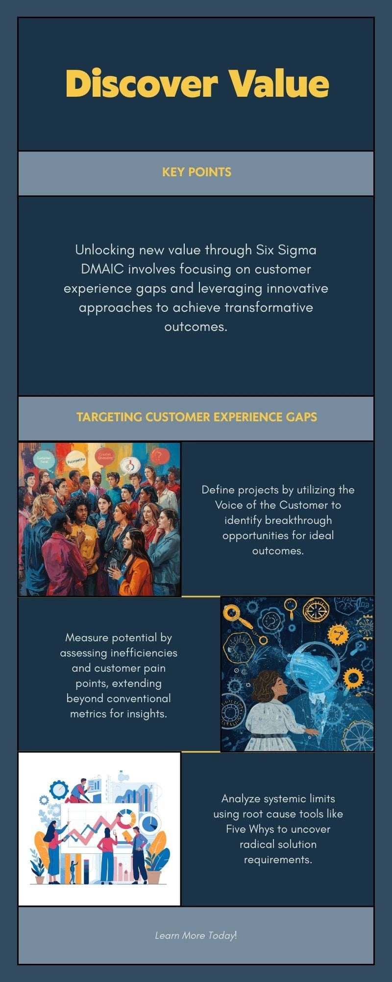 - DMAIC Re-purposed: Each phase of DMAIC is redefined: Define identifies the ideal customer experience gap; Measure quantifies untapped potential; Analyze discovers systemic limitations; Improve pilots radical concepts; and Control formalizes the new, innovative process.