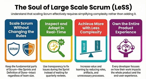 - Simplicity is King: LeSS is about removing roles and processes, not adding them.