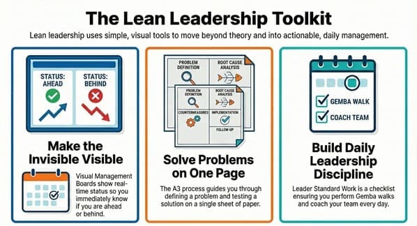 While the mindset is key, some tools make lean leadership easier to track. You don’t need a PhD to use these. They are simple by design.