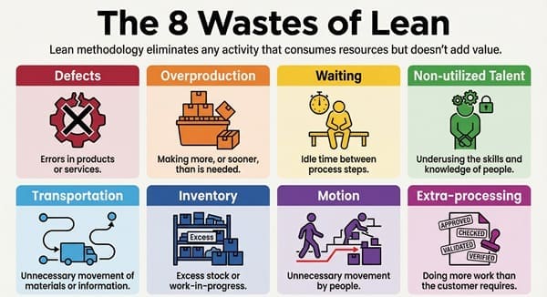 Lean methodology focuses on eight common types of waste, often remembered by the acronym DOWNTIME: