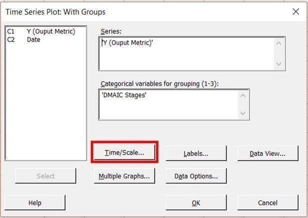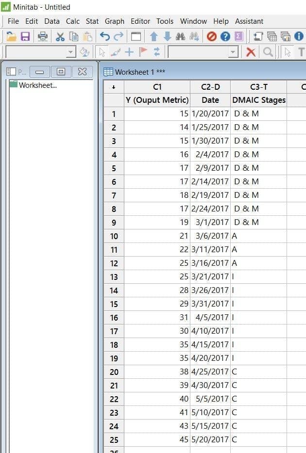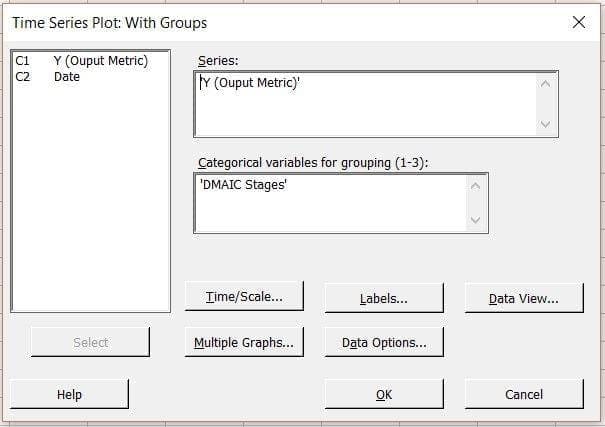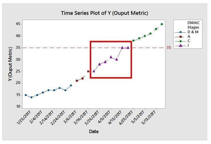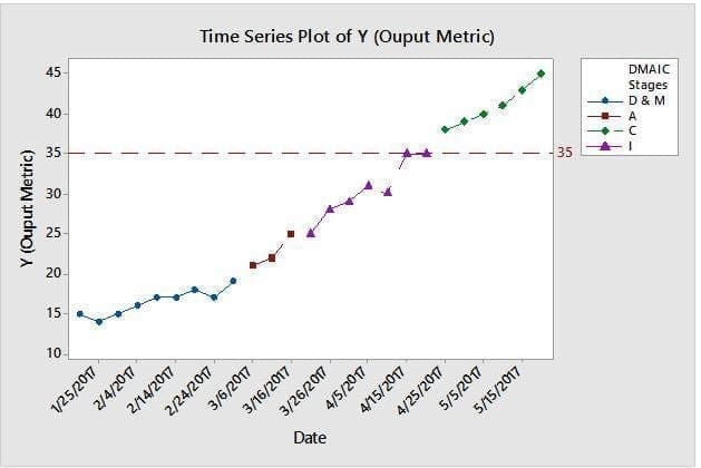 As you make changes to the process during any of the DMAIC stages, there should be a measurable effect. The Time Series chart will plot the effect.