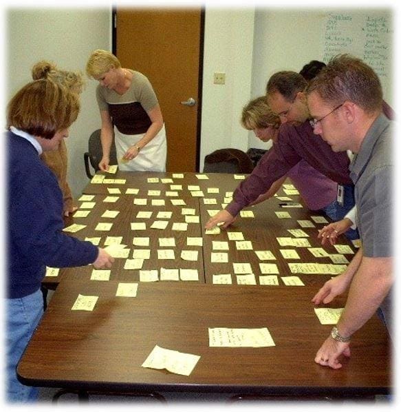 In this step, we group the post-it notes by their relationships (or Affinities) to each other. For Example, there may be a group of Post-It notes that are Inspections or Vetting of a Product or Transaction. In this case, we would put them together in a group called “Vetting”.