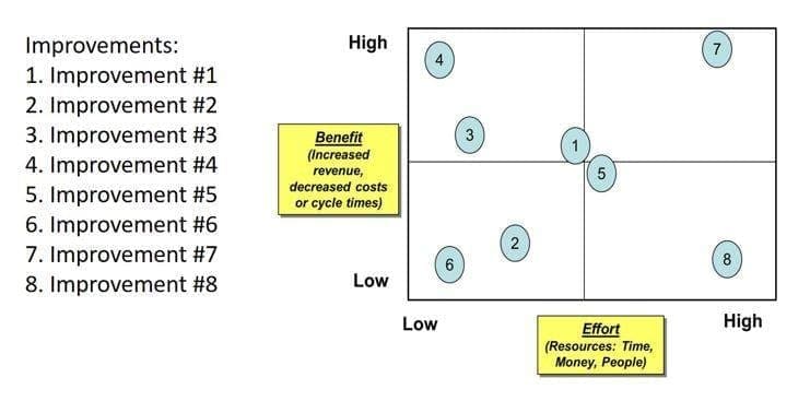 The picture below is an example of a “Payoff Matrix. We usually have a flip chart with the numbered list of improvements and another flip chart for the matrix.