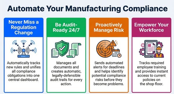 Why should you care so much about compliance in manufacturing? Ignoring these manufacturing laws and regulations can lead to big fines, product recalls, and harm your company’s good name. This guide helps you understand the different parts of manufacturing legal requirements and shows you how smart tools like manufacturing compliance software can make your job easier.