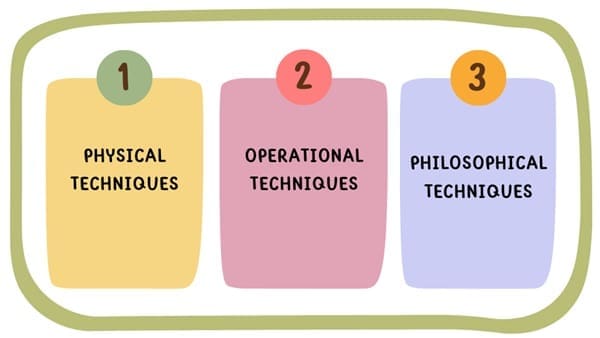 It can be implemented through three main techniques: physical, operational, and philosophical approaches.
