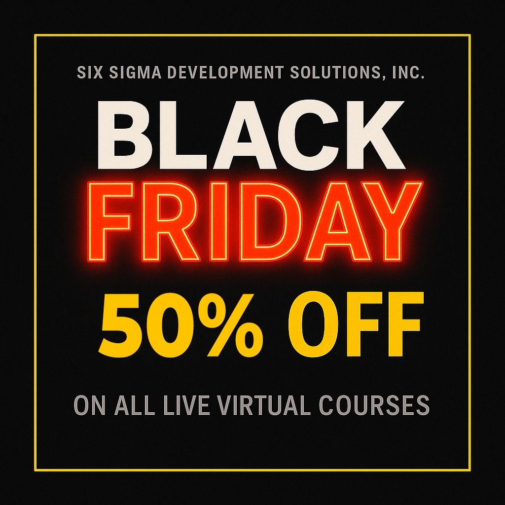Take your career forward in 2026 with a five day Live Virtual Lean Six Sigma Green Belt or Black Belt course at half the regular price. This digital voucher gives you a 50 percent discount for any public Live Virtual Lean Six Sigma program offered by Six Sigma Development Solutions Inc during the 2026 training calendar.