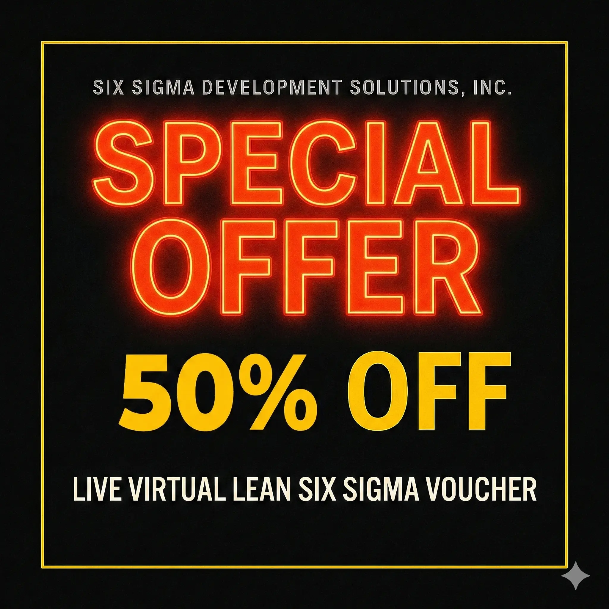 Advance your career with a comprehensive 5-day Live Virtual Lean Six Sigma Green Belt or Black Belt course. Specifically, this digital voucher grants you full enrollment in any public program offered by Six Sigma Development Solutions, Inc. (SSDSI) at a special promotional rate.