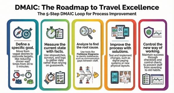 Once we find the “root cause,” we fix it. We test new ideas. Maybe we use a digital paging system for guests. Or perhaps we change the layout of the dining room. This is the stage where we make the actual changes to how the travel business runs.