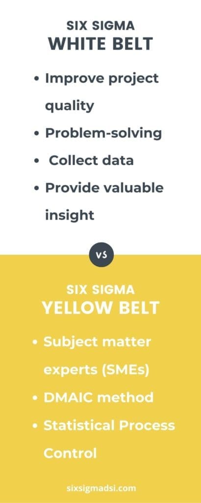 - The White Belt and Yellow Belt offer you the opportunity to be an integral part of Six Sigma’s world.