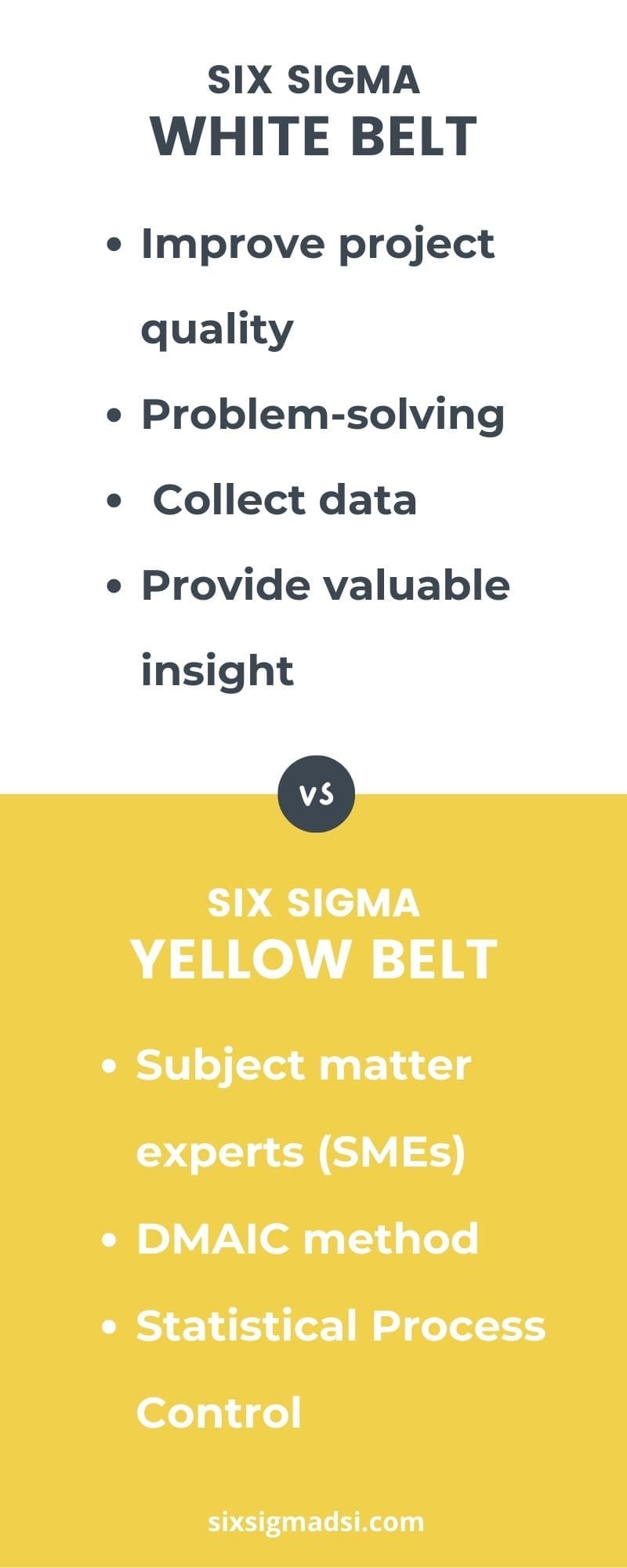 - The White Belt and Yellow Belt offer you the opportunity to be an integral part of Six Sigma’s world.