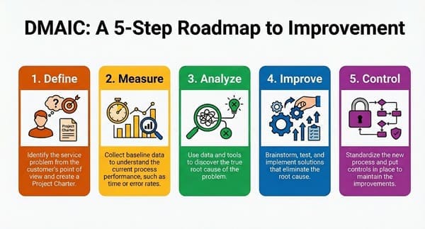 - The DMAIC methodology is tailored for service contexts, focusing on defining problems, measuring data, analyzing causes, improving processes, and controlling outcomes.