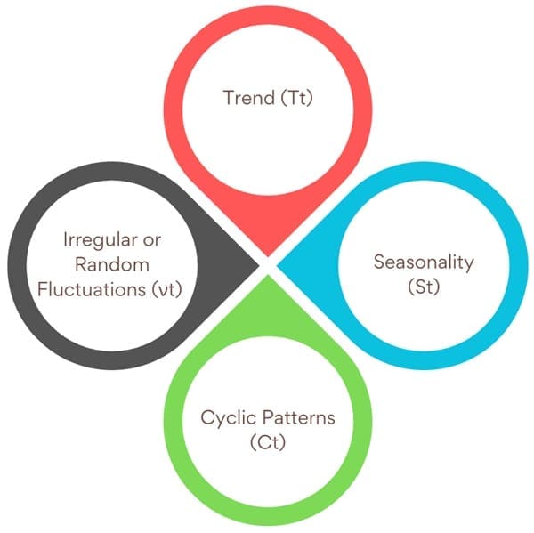 - Irregular or Random Fluctuations (νt): These are unpredictable variations that the trend, seasonality, or cyclic components cannot explain. They represent the “noise” in the data.