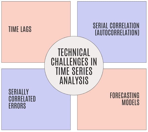- Time lags: Events in time series data may not affect the series immediately but rather after a delay. For example, changes in interest rates by the Federal Reserve may take several months to influence inflation or unemployment.