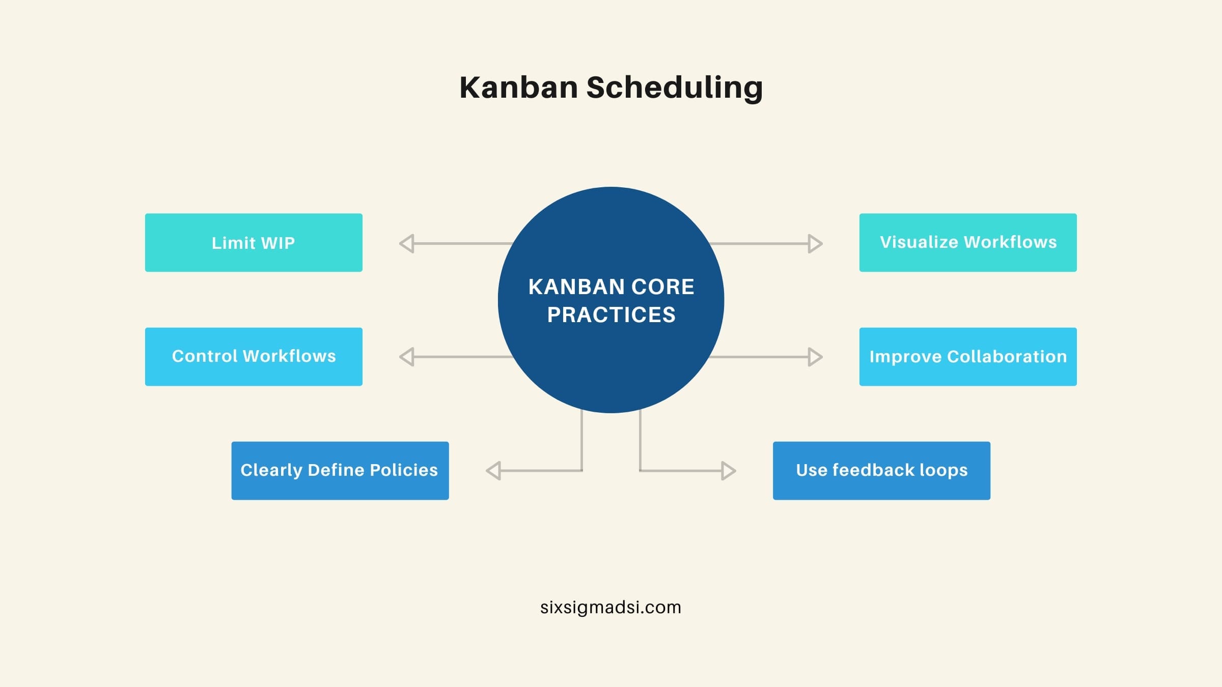 Kanban scheduling is a method of organizing work in lanes. This can be easily explained by using a simple example. This is a sample Kanban scheduling method that a supermarket might use.