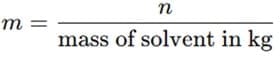 - Molality (m): Molality is the number of moles of solute per kilogram of solvent. It is used when temperature changes are involved because it does not depend on the solution’s volume. The formula for molality is: