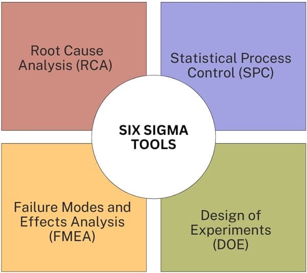 Six Sigma practitioners use tools such as Statistical Process Control (SPC), Design of Experiments (DOE), and Failure Modes and Effects Analysis (FMEA) to measure, analyze, and improve processes.