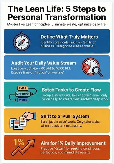 Why not put more lean into your life starting today? We’ve talked about the wastes, the principles, and the practical steps to reclaim your time. Lean isn’t about being a robot; it’s about being more human by removing the mechanical, wasteful parts of our existence.